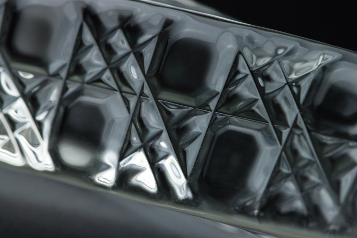 角柱のデザインとなっており、4面あるうちの1面に江戸切子が施されています。透明部分から覗いてみると江戸切子の反射がきれいに映し出されます。「半ひねり-HINERI Half-」はグリップ部分をしっかりねじり、ペン軸の後半はストレートラインで八角籠目文様を味わうデザインとなっております。